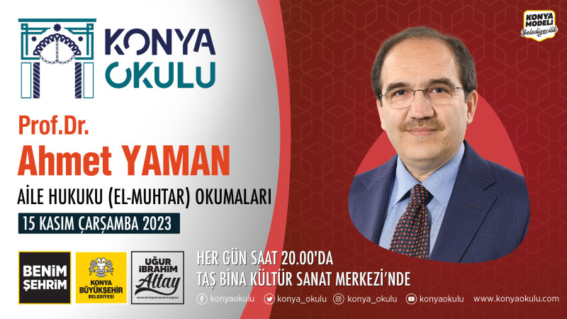 Konya Büyükşehir Belediyesi Tarafından Düzenlenen Konya Okulu "AİLE HUKUKU (EL-MUHTAR) OKUMALARI" Prof. Dr. Ahmet YAMAN'ın katılımıyla 08 Kasım Çarşamba 2023 Saat 20.00'da Taş Bina Kültür Sanat Merkezi'nde